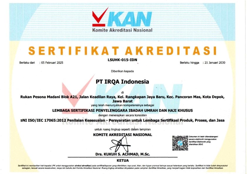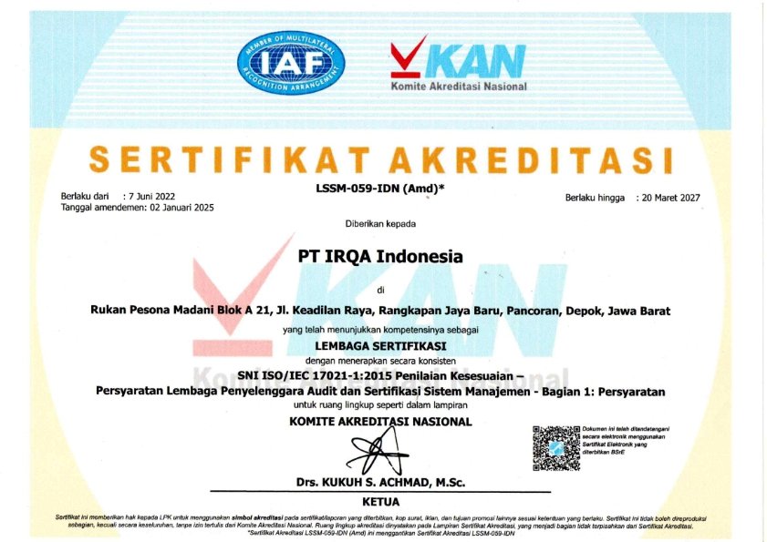 Di Indonesia, badan sertifikasi yang berwenang memberikan sertifikasi ISO harus terakreditasi oleh Komite Akreditasi Nasional (KAN). KAN memastikan bahwa badan sertifikasi tersebut kompeten dan independen dalam melakukan audit serta penerbitan sertifikat ISO. Organisasi yang ingin mendapatkan sertifikasi ISO sebaiknya memilih badan sertifikasi yang telah diakui oleh KAN untuk menjamin keabsahan dan kredibilitas sertifikat yang diperoleh. KAN adalah lembaga yang mengeluarkan sertifikat iso.